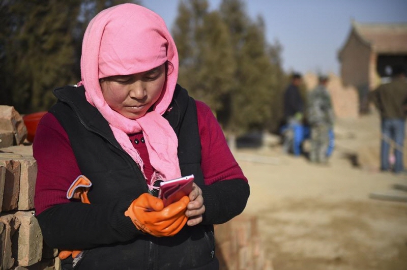 ▲ 2016년 3월 2일 마후이쥐안이 휴게시간에 휴대전화로 글을 쓰고 있다. (사진/신화통신) |