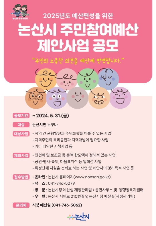 공모에 참여하고자 하는 시민은 신청서를 작성해 논산시청 홈페이지에 제출하거나 논산시청 예산실 또는 거주하는 읍․면사무소 및 동 행정복지센터에 접수하면 된다.