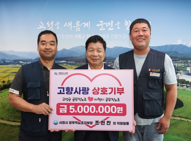 천재호 고성군공무직노조지부장은 “이번 상호 기부를 통해 고성군과 사천시의 지역 발전에 도움이 되기를 바라는 마음에서 상호 기부를 진행하게 됐다”라고 말했다.