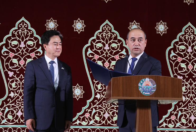 [뉴스서치] 김태흠 충남도지사는 6일 충남-우즈베키스탄 페르가나 합동공연이 열린 사로이예 공연장에서 바코디르존 셰르무함도프 페르가나주 국립대학 총장으로부터 명예박사 학위를 받았다.