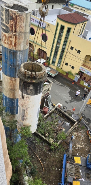 ▲ 진주시, ‘2024년 노후 굴뚝 정비사업’ 1호 굴뚝 철거 완료 |