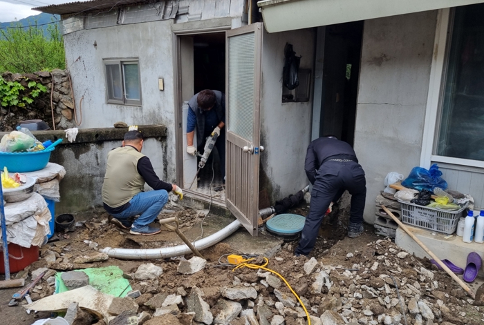 이날 건설기계협의회 회원 16여 명은 악양면, 양보면의 가구 2곳을 직접 찾아 수도관 노출배관 보수작업과 창고 매몰 철거 작업 및 정리 작업을 진행했다.