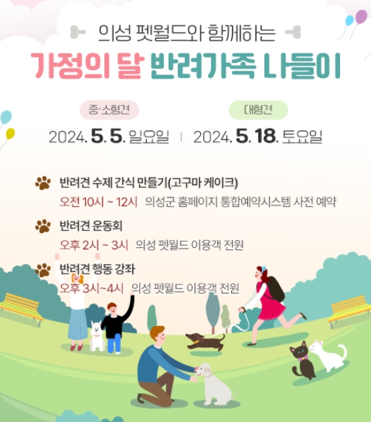 이번 가정의 달 기념 프로그램은 온 가족이 다 함께 즐길 수 있도록 반려견 수제 간식 만들기, 댕댕 운동회, 반려견 행동 강좌로 구성되며 특히, 반려견 가족에게 인기가 많은 반려견 수제 간식 만들기 체험은 5일, 18일 오전 10시부터 2시간 진행될 예정이며, 의성군 온라인 예약 시스템에서 선착순으로 모집하고 있다.