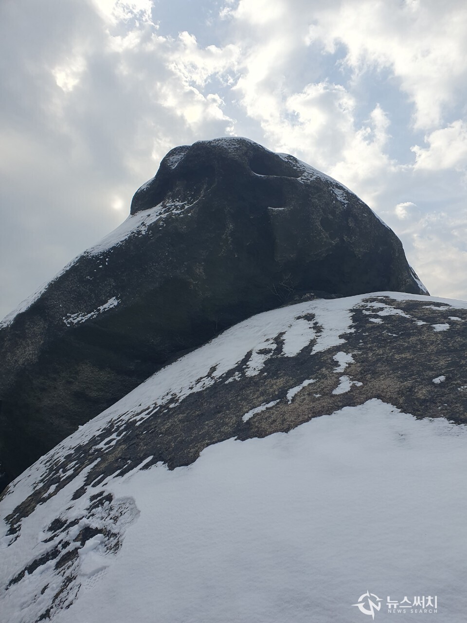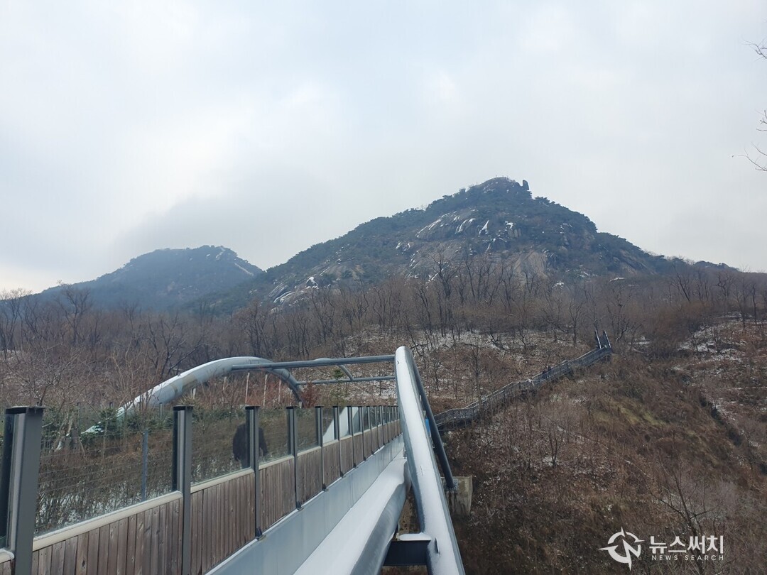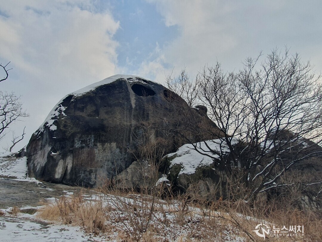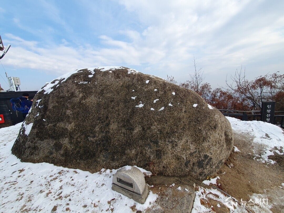 필자는 인왕정을 지나 해골바위를 향해 걸음을 내딛었다. 인왕정 지나 해골바위로 가는 길은 나무데크길로 잘 꾸며져 있어 편안하게 걸을 수 있었다. 오전 10시 55분 인왕산에 있는 특이한 바위 중의 하나인 ‘해골바위’에 도착하였다. 전날 내린 눈으로 해골바위 위에는 하얀 눈이 쌓여 있었다.