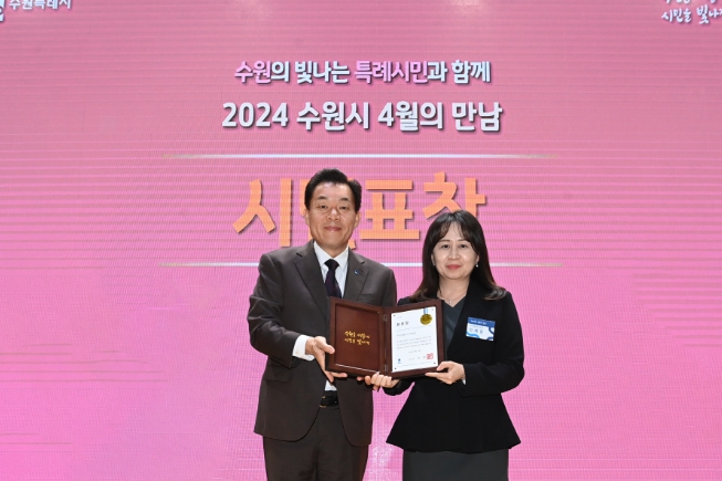 수원시육아종합지원센터 아이사랑놀이터 호매실점은 4월 1일 수원시청 대강당에서 열린 ‘4월의 만남’ 행사에서 수원시장상을 받았다.
