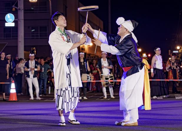 ▲ 지난 1~3일 아사히카와 교류협력 35주년을 기념해 수원시가 파견한 전통공연단과 아사히카와 시장이 합동 공연을 하고 있다. |