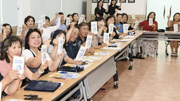 ▲ 지난 8일 평동 행정복지센터에서 통장협의회를 대상으로 ‘찾아가는 자원순환정책 설명회’가 열려 참석자들이 팜플렛을 들어 보이고 있다. |