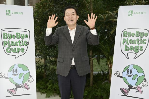 ▲ 이재준 수원특례시장이 지난해 10월 ‘바이바이 플라스틱 챌린지’에 동참하는 기념촬영을 하고 있다. |