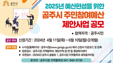 [뉴스서치] 공주시는 2025년 주민참여예산 편성을 위한 ‘주민제안사업 공모’를 오는 11일부터 6월 10일까지 2개월간 진행한다고 3일 밝혔다.