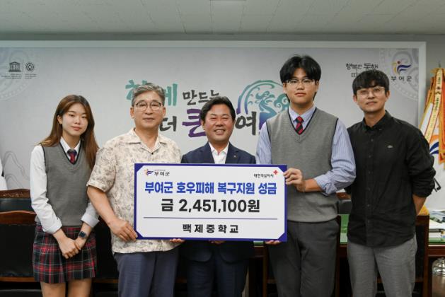 [뉴스서치] 백제중학교는 지난 28일 부여군청을 찾아 수해로 어려움을 겪는 이웃에게 사용해 달라며 자치활동으로 만든 수익금 2,451,100원을 전달했다. 이날 성금 전달식에는 박정현 부여군수, 이존석 백제중학교 교장, 박종일 담당 교사, 김경환 학생자치회장, 이은솔 생활자치부장이 참석했다.