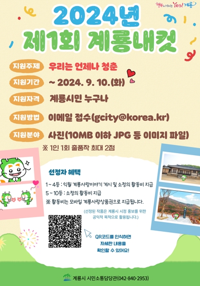 이번 계룡내컷 공모전은 ‘우리는 언제나 청춘’이라는 주제로 계룡의 일상을 찍은 사진 파일 1장과 지원서를 이메일로 제출하면 되며, 계룡시민이라면 누구나 참여 가능하다.