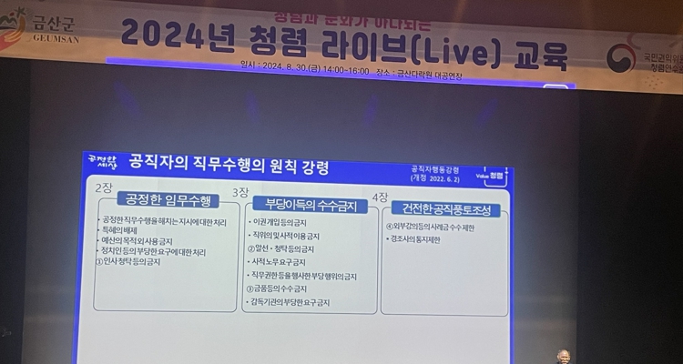 [뉴스서치] 금산군은 지난 8월 30일 금산다락원 생명의 집 대공연장에서 공직자 300여 명을 대상으로 청렴한 조직문화 조성을 위한 ‘청렴 라이브(Live)’ 교육을 시행했다.