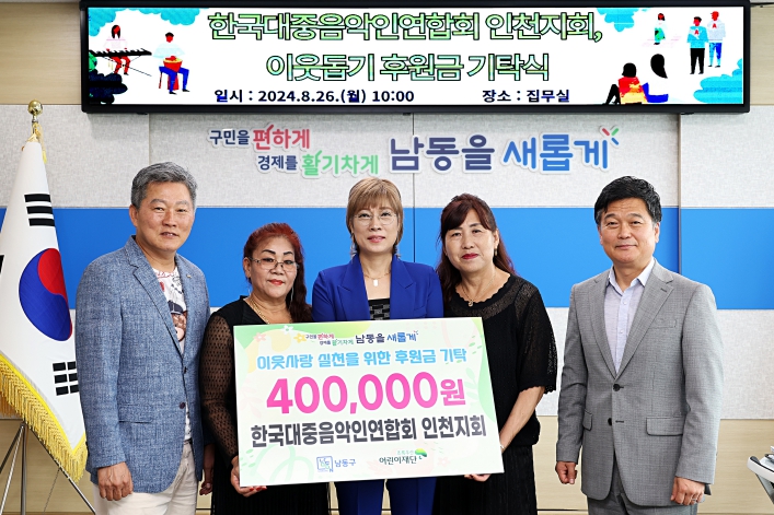[뉴스서치] 인천시 남동구는 한국대중음악인연합회 인천지회로부터 이웃돕기 후원금 40만 원을 기탁받았다고 30일 전했다.