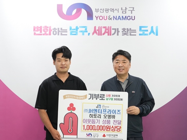 | ▲ (주)JH엔터프라이즈, 부산 남구에 100만원 상당 후원물품 전달 |