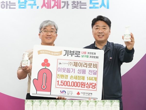 [뉴스서치] ㈜제이라로비에서는 지난 15일 부산광역시 남구에 150만원 상당의 후원물품(손세정제)을 전달했다.