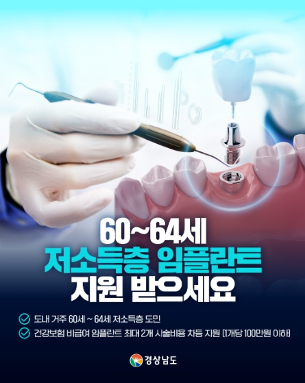 박완수 경남도지사는 “60~64세 저소득층 임플란트 지원사업을 통해 보다 많은 도민이 경제적 부담을 완화하여 구강 기능 회복할 수 있도록 많은 참여를 바란다” 라며, “앞으로도 적극적인 취약계층 구강보건사업을 추진하겠다”라고 밝혔다.