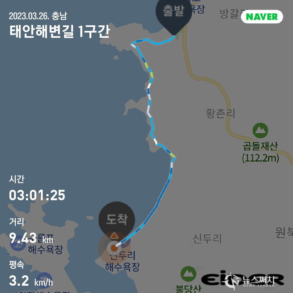 이번 ‘태안해변길 1코스(바라길)’ 트레킹 거리는 9.43km 였고, 트레킹 시간은 휴식시간을 포함하여 3시간 1분이 소요되었다.