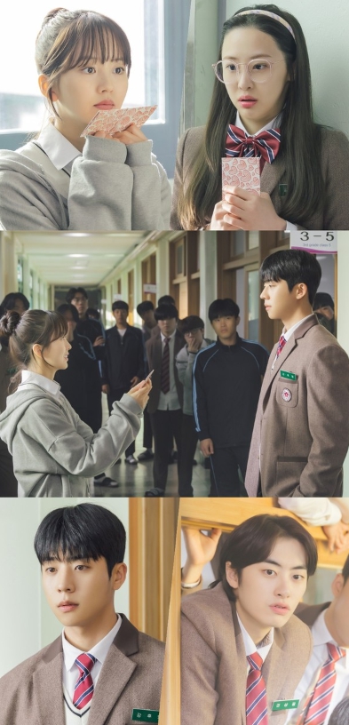 이날 공개된 사진은 이홍주, 강후영, 김혜지, 권상필의 엇갈린 첫사랑을 예고한다. 떠들썩하게 모여든 남학생들 사이로 강후영에게 러브레터를 건네는 ‘위풍당당’ 이홍주의 모습이 호기심을 자극한다.