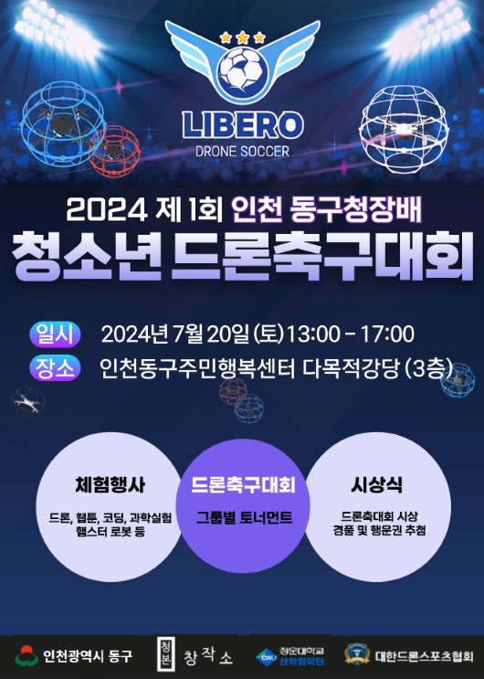 [뉴스서치] 인천 동구 청본창작소에서는 오는 20일 주민행복센터 3층 다목적강당에서 ‘제1회 동구청장배 청소년드론 축구대회’를 개최한다고 밝혔다.