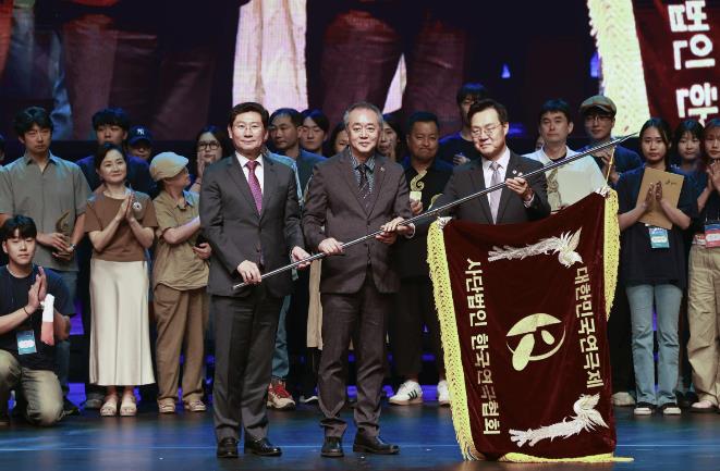 ▲ 이상일 용인특례시장이 내년에 '대한민국연극제' 개최지 인천광역시에 대회기를 이양하고 있다. |