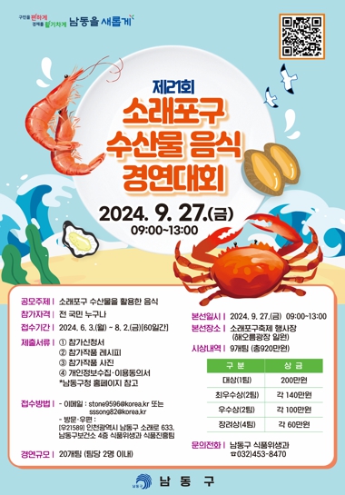 이번 경연대회는 전 국민 누구나 참가할 수 있으며, 새우‧게 등 소래포구 수산물을 활용한 음식을 주제로 진행된다.