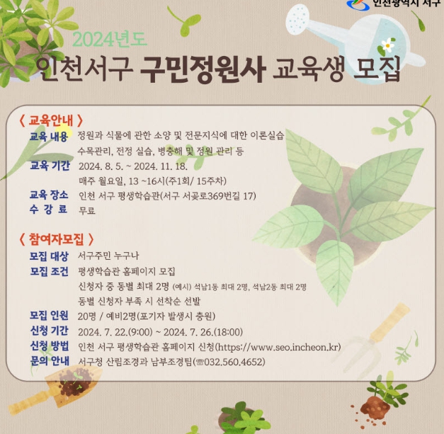 [뉴스서치] 인천 서구는 2024년 하반기 구민정원사 양성과정을 진행한다고 밝혔다.