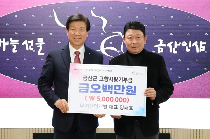 박범인 금산군수는 “금산군의 발전을 위해 기부에 동참해 주신 양태호 대표께 감사드린다”며 “이번 최고한도액 기부를 계기로 고향사랑을 위한 기부가 늘어나길 기대한다"고 말했다.