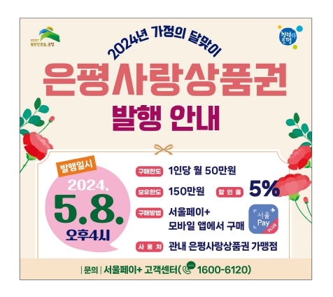 [뉴스서치] 은평구는 5월 가정의 달을 맞아 72억 원 규모의 은평사랑상품권을 오는 8일에 5% 할인된 금액으로 판매한다고 밝혔다.