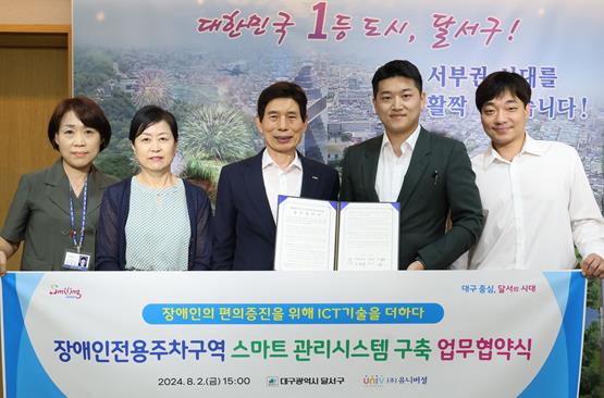 달서구는 8월 2일 ㈜유니버셜(대표 김경석)과 업무협약을 체결했으며, 양 기관은 장애인전용주차구역 1면에 스마트 주차관리시스템을 구축하기 위한 기기의 설치, 유지보수, 기술지원, 행정지원 등을 상호협의해 추진한다.