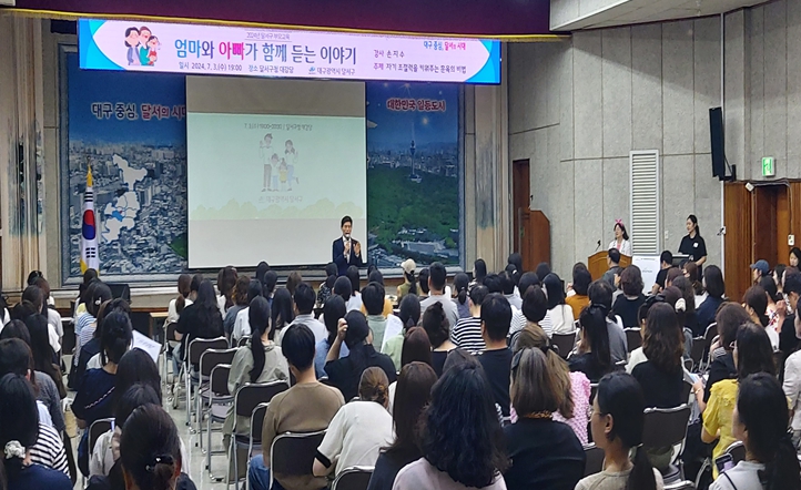 [뉴스서치] 대구 달서구가 3일 구청 대강당에서 영유아의 건전한 성정과 올바른 부모상 정립 및 행복한 양육방법을 안내하는'2024년 부모교육'의 2번째 강연을 실시했다.