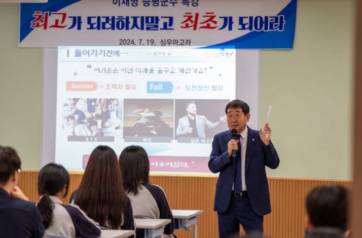 [뉴스서치] 이재영 증평군수는 19일 형석고등학교를 방문해 ‘최고가 되려 하지 말고, 최초가 되어라’를 주제로 특강을 진행했다.