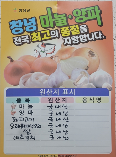 ▲ 식당에 부착된 창녕 마늘·양파 홍보내용을 담은 원산지 표시판 |