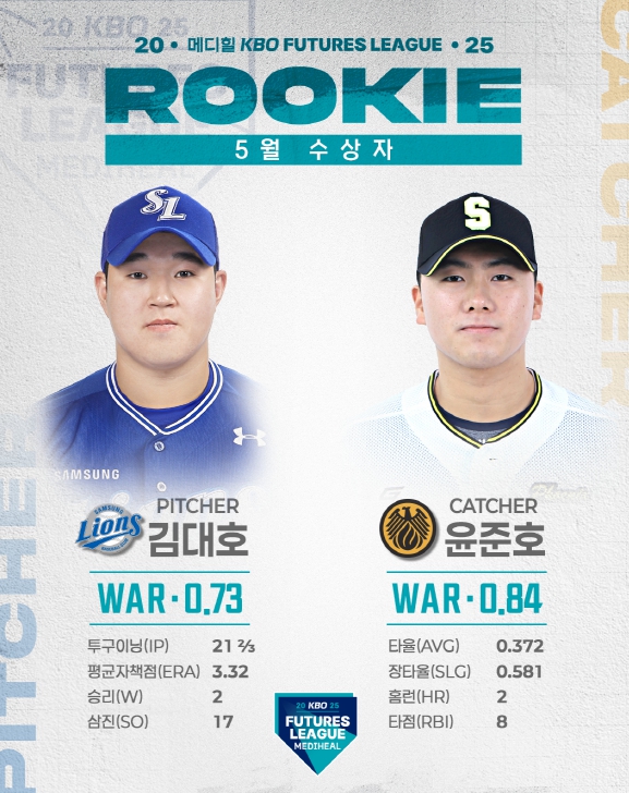 투수 부문 수상자인 삼성 김대호는 군산상고와 고려대를 졸업한 뒤, 2024년에 삼성에 육성선수로 입단했다. 지난해 8월 퓨처스 루키상을 수상한 바 있어, 이번 수상으로 두 번째 루키상 수상의 영예를 안게 됐다. 타자 부문 수상자인 상무 윤준호는 경남고와 동의대를 거쳐, 2023 신인 드래프트에서 5라운드 49순위로 두산에 지명됐으며, 2024년 6월 상무에 입대한 이후 퓨처스리그에서 꾸준히 활약 중이다.