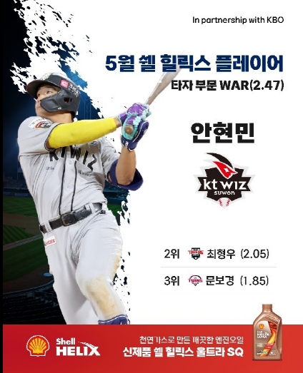 ‘쉘힐릭스플레이어’는 WAR(대체 선수 대비 승리 기여도)을 기준으로 선정하며, 5월 타자 부문에서는 KT 안현민이 WAR 2.47로 1위를 차지했다. 안현민은 5월 한 달간 타율 0.333, 출루율 0.419, OPS 1.125를 기록하는 등 뛰어난 타격감을 보였다. 이와 함께 홈런 9개(공동 2위), 안타 34개, 득점 18점을 기록하며 출루 능력과 장타력을 겸비한 활약으로 타자 부문 1위를 차지했다.