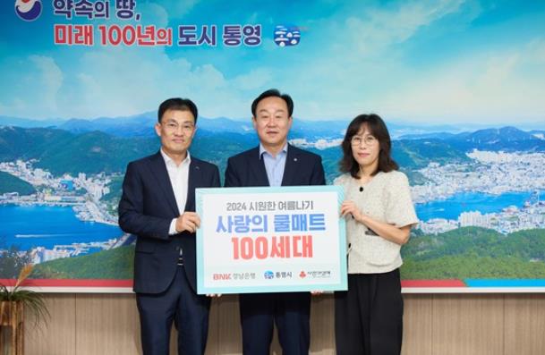 [뉴스서치] BNK경남은행은 7월 16일, 여름철을 맞아 무더위에 취약한 저소득층에 전달해 달라며 쿨매트 100개(300만원 상당)를 통영시에 기탁했다.