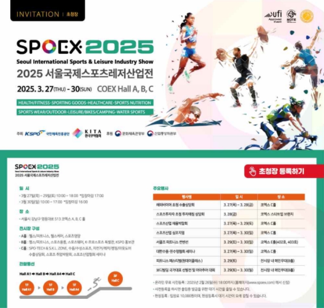 이번 산업전은 3월 26일 오후 6시까지 서울국제스포츠레저산업전 누리집을 통해 온라인 사전 등록하면 무료로 입장할 수 있으며, 현장 결제 시 입장료는 1만 원이다.