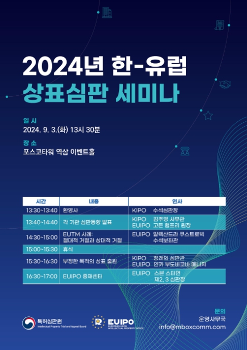 유럽연합지식재산청(EUIPO) 심판원은 국내 출원인의 유럽연합 상표분쟁 해결을 돕기 위해 유럽연합지식재산청 상표제도에서 절대적·상대적 거절이유와 유럽연합지식재산청 중재센터에 대해 소개한다. 또한 양 기관은 상표심판 동향 및 정책방향, 부정한 목적의 상표 출원에 대한 심판사례에 대해 발표한다.