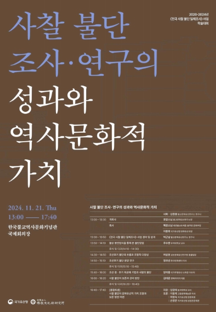 [뉴스서치] 국가유산청은 (재)불교문화유산연구소와 함께 11월 21일 오후 1시 한국불교역사문화기념관 국제회의장(서울 종로구)에서 2020년부터 올해까지 5년간 추진해 온 '전국 사찰 불단 일제조사' 사업의 성과를 발표하고 향후 과제를 논의하는 학술대회를 개최한다.