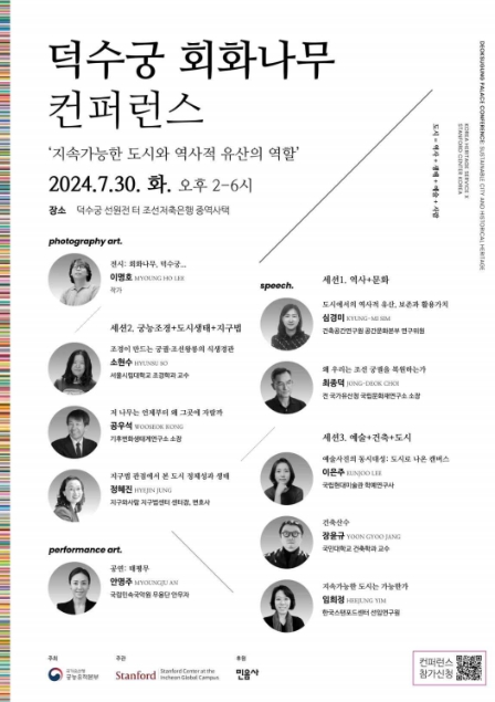 한편, 7월 30일 오후 2시에는 궁능유적본부와 한국스탠포드센터의 공동 주관으로 덕수궁 복원의 의의를 비롯해 도시에서 국가유산이 지닌 역할의 중요성을 새롭게 인식하고, 이를 지구라는 거시생태계 관점에서 건축, 도시, 조경 등의 세부 주제로 나눠 논의해보는 학술회의가 열린다. ▲ 도시에서의 역사적 유산, 보존과 활용가치(심경미, 건축공간연구원 연구위원), ▲ 왜 우리는 조선 궁궐을 복원하는가(최종덕, 전 국립문화재연구소장), ▲ 조경이 만드는 궁궐·조선왕릉의 식생경관(소현수, 서울시립대 조경학과 교수), ▲ 저 나무는 언제부터 왜 그곳에 자랄까(공우석, 기후변화생태계연구소 장), ▲ 지구법 관점에서 본 도시 정체성과 생태(정혜진, 지구와사람 지구법센터장), ▲ 건축산수(장윤규, 국민대 건축학과 교수), ▲ 지속가능한 도시는 가능한가(임희정, 한국스탠포드센터 선임연구원)까지 각 분야 전문가들의 7개 주제발표와 주제발표 내용을 토대로 발표자 전원이 함께 참여하는 토론으로 진행된다.