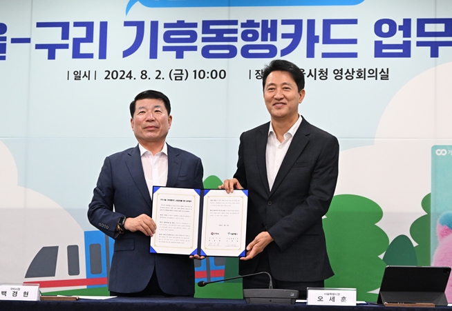 서울시는 8월 2일 오전 10시 서울시청(6층 영상회의실)에서 '서울시-구리시 ‘기후동행카드’ 사업 참여 업무협약'을 맺고 오세훈 서울시장과 백경현 구리시장이 양 도시 간 광역교통 협력체계 강화를 위한 논의를 나눈다. 이 자리에는 김희갑 서울시 교통기획관, 여호현 구리시 도시개발교통국장도 참석해 실무적인 사항에 대한 의견도 교환할 예정이다.