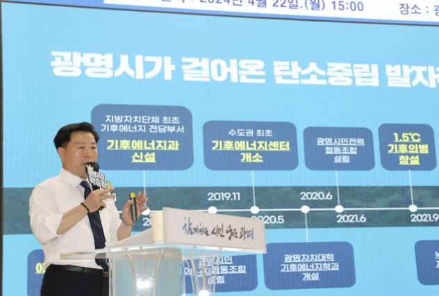 ▲ 광명시는 지난 4월 22일 '시민의 목소리를 듣는 청책토론회-2024년 광명시 기후회의'를 개최했다. 사진은 광명시가 추진해 온 탄소중립 정책에 대해 설명하고 있는 박승원 광명시장. |
