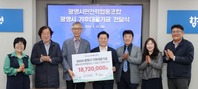 이에 따라 광명시민전력협동조합은 광명시민의 참여로 생산한 태양광발전소 전력 판매 수익 1천8백7십2만 원을 기부했다. 기부금은 광명시가 탄소중립 선도도시로 가는 소중한 재원으로 쓰이게 될 예정이다.