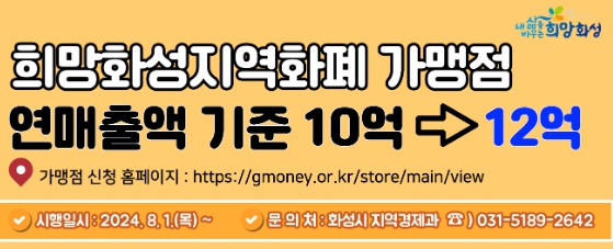 ▲ 화성시, 8월부터 희망화성지역화폐 가맹점 연 매출 제한 12억 원으로 상향 |