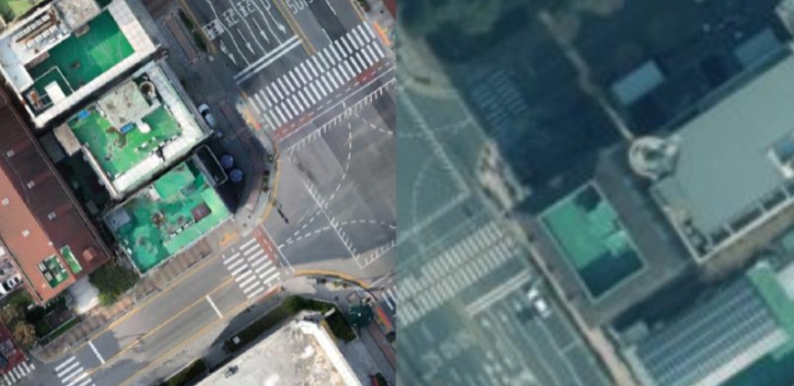 ▲ 만안구청 앞 사거리 드론지도(왼쪽)와 위성지도(오른쪽) |