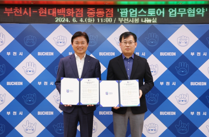 [뉴스서치] 부천시는 지난 4일 부천시청 나눔실(5층)에서 현대백화점 중동점과 ‘식품산업 육성을 위한 팝업스토어 운영 업무협약’을 체결했다.