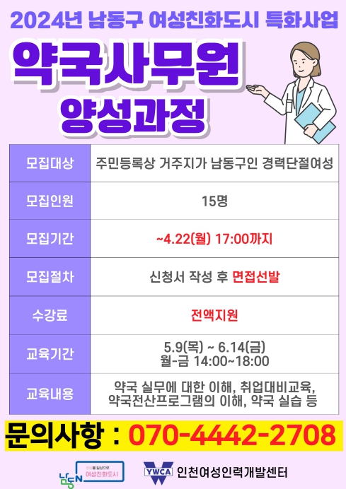 [뉴스서치] 인천시 남동구는 경력단절 여성 취업 지원을 위해 ‘2024년 약국사무원 양성과정’ 참여자를 모집한다고 20일 밝혔다.