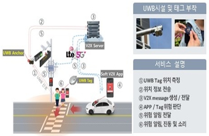태그를 부착한 학생과 차량과의 거리 정보를 실시간 수집하고, 인공지능(AI) 기반 CCTV 및 교차로 주변에 설치된 초광대역 수신 인프라와 연계해 사고 위험이 감지될 경우 학생 뿐만 아니라 자동차・퀵보드・자전거 운전자의 스마트폰에 경고 메시지를 전송하는 통신 단말기 역할을 한다.