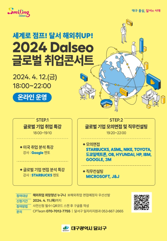[뉴스서치] 대구 달서구는 4월 12일 해외취업을 희망하는 청년들을 대상으로『2024년 Dalseo 글로벌 취업콘서트』를 온라인으로 개최한다.