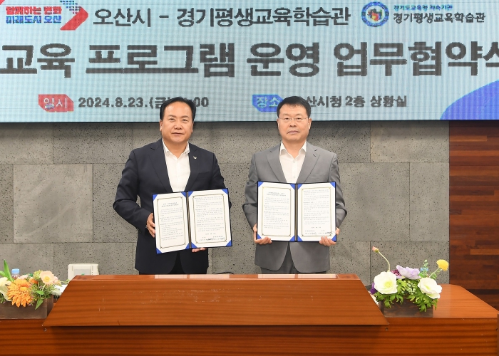 [뉴스서치] 오산시는 경기평생교육학습관과 23일 오산시청에서 이권재 오산시장, 조정수 경기평생교육학습관장 등이 참석해 업무협약을 체결해 평생교육 활성화에 협력하기로 했다.