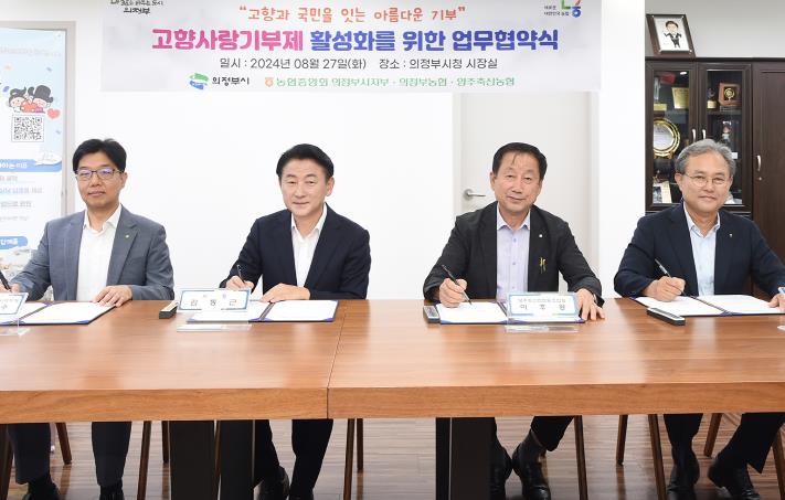 [뉴스서치] 의정부시는 8월 27일 농협중앙회 의정부시지부, 의정부농업협동조합, 양주축산업협동조합과 고향사랑기부제 활성화를 위한 업무협약을 체결했다.